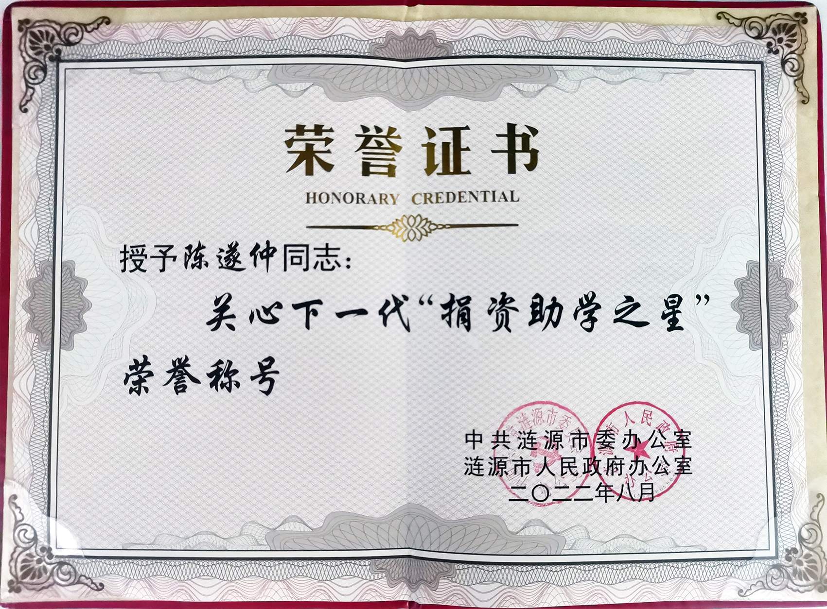 此次获奖,是继陈遂仲2019年被授予关心下一代“捐资助学模范”以及2020年“捐资助学标兵”荣誉称号之后,第三次在涟源市慈善事业中受到嘉奖。