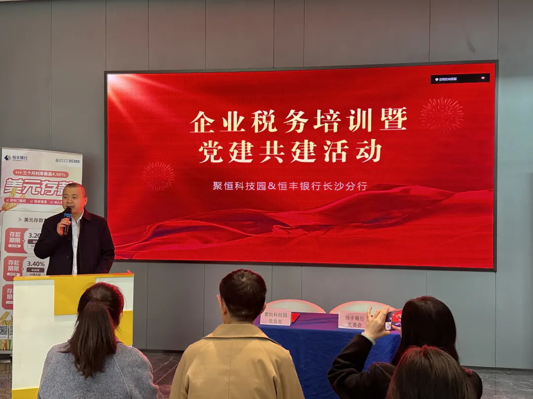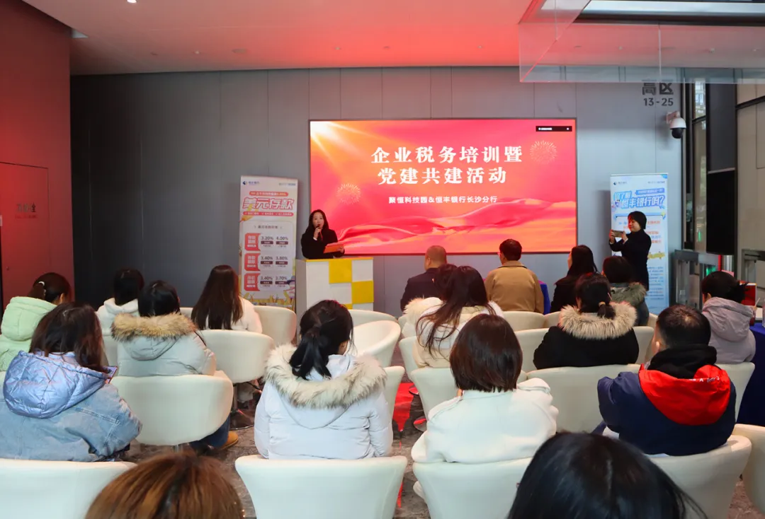 2024年12月11日下午,hth华体会官网科技园党总支携手恒丰银行股份有限公司长沙分行支委会,共同举办了“红色合伙人·银企党建共建暨企业税务培训活动”,旨在深入学习贯彻习近平新时代中国特色社会主义思想,共建区域化共驻共建工作新格局,通过创新党建工作模式,深化银企合作,充分发挥党组织的战斗堡垒和党员的先锋模范作用,推进资源共享、优势互补、文明共建、共同发展。